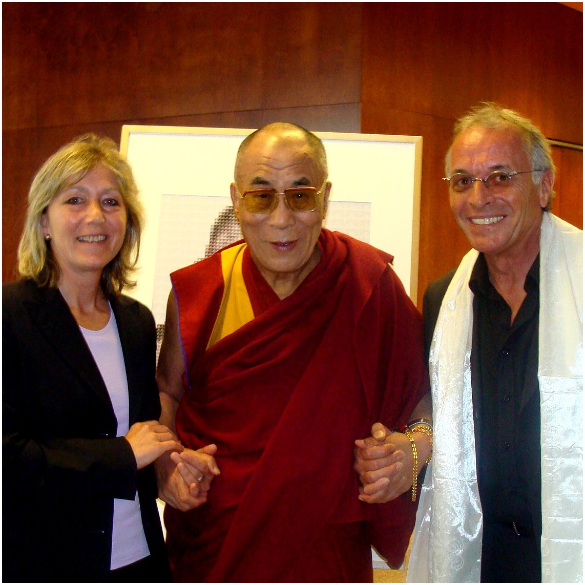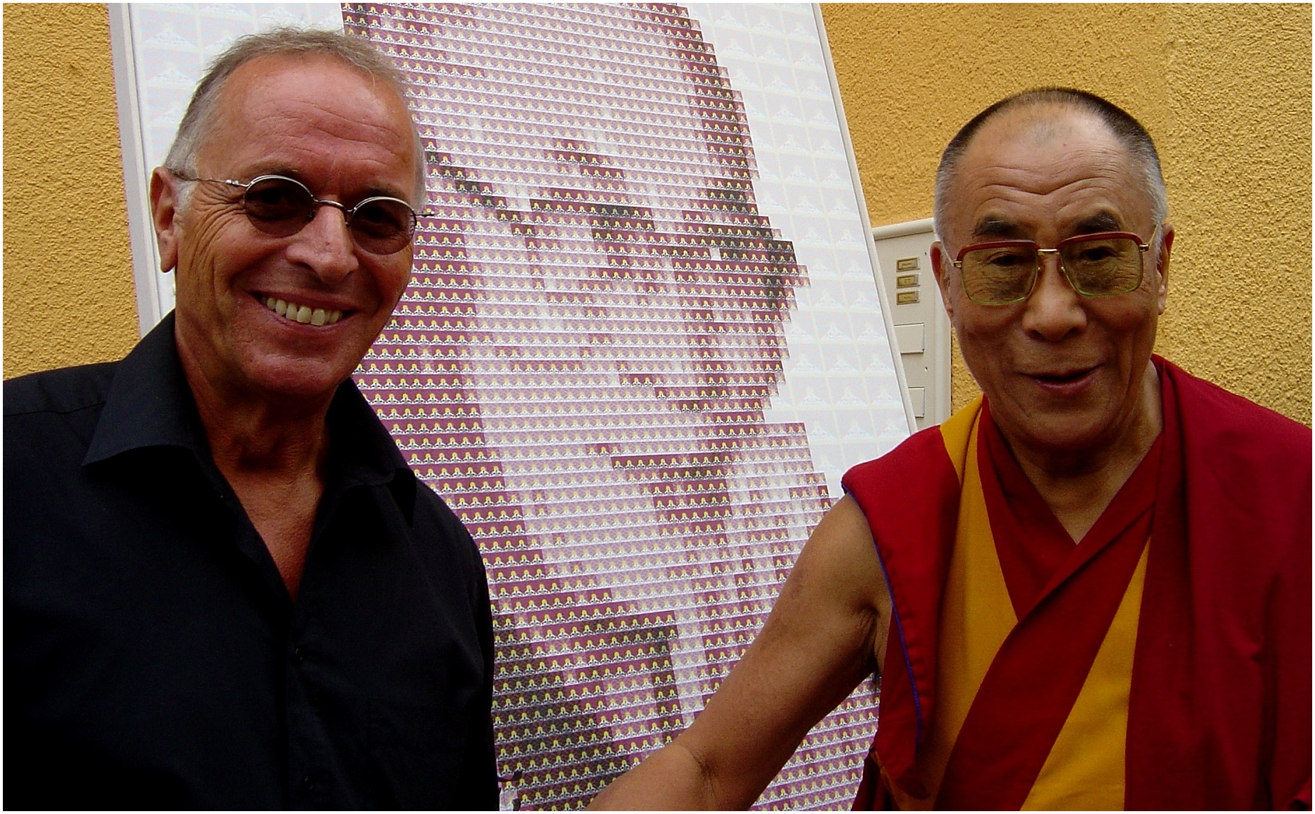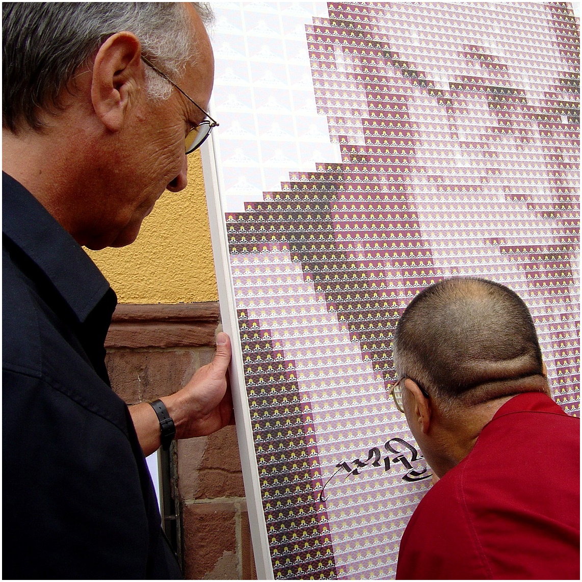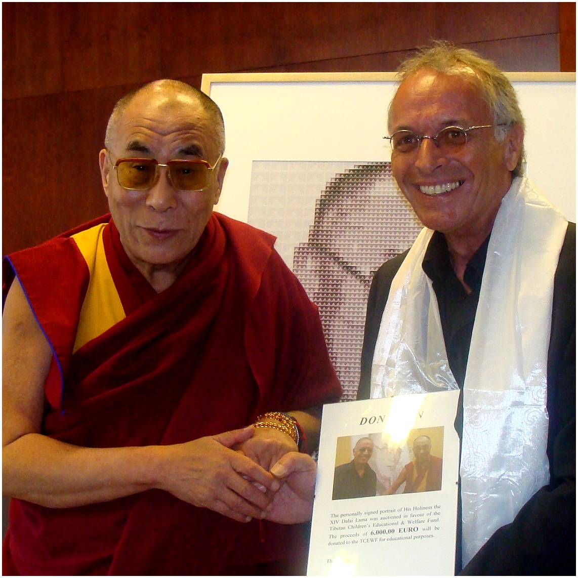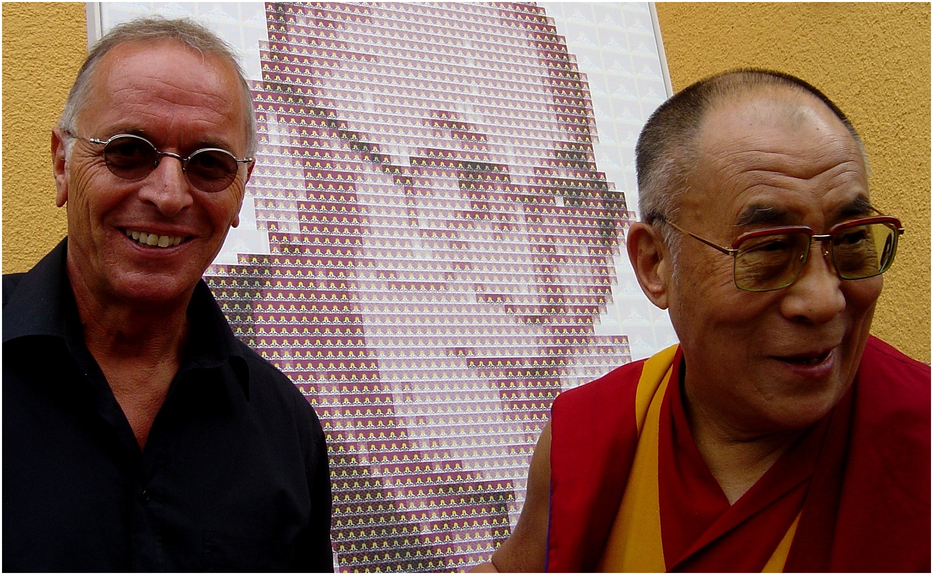 Am 28.07.2007 traf ich in Freiburg den 14. Dalai Lama, um mein Bild des geistigen und weltlichen Oberhauptes der Tibeter signieren zu lassen. Das manuell entwickelte Werk setzt sich pixelartig aus über 3.000 Einzelbildern der tibetischen Flagge zusammen und lässt in seiner Gesamtheit ein Portrait des Dalai Lama erkennen. Das auf Leinwand gedruckte Original hat eine Größe von 135 x 100 cm. Das signierte Unikat wurde zugunsten tibetischer Kinder in Dharamsala, Indien verkauft (Tibetan Children’s Educational & Welfare Fund www.sherig.org ). Der Erlös von 6000,00 Euro wurde dem TCEWF für schulische Zwecke gespendet und dem 14. Dalai Lama am 16.05.2008 in Bochum symbolisch überreicht.